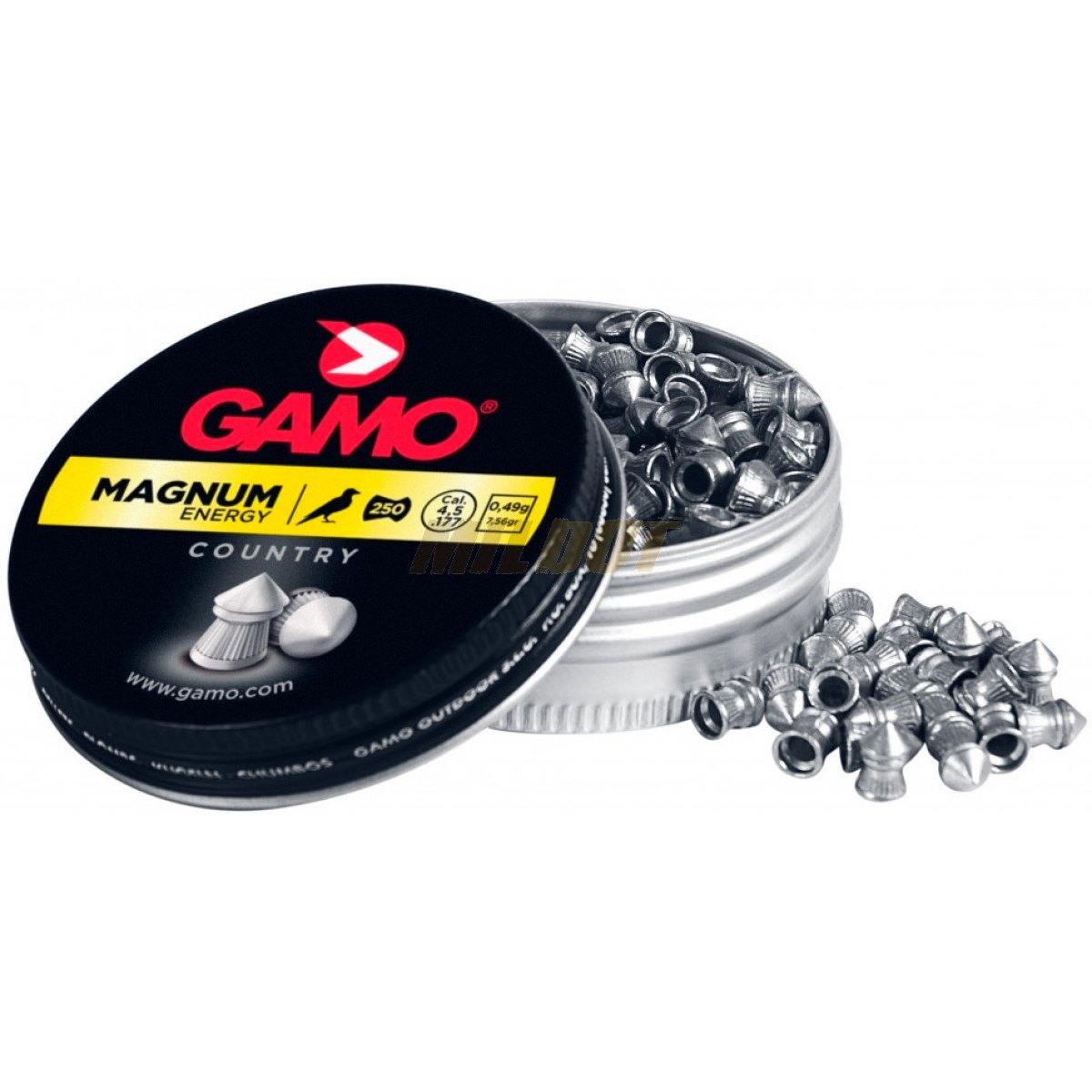 Lata de 250 balines GAMO Magnum Country del calibre 4.5mm (.177). Unos balines idóneos para la práctica del tiro deportivo gracias a su gran precisión. Material: plomo. Peso de cada balín: 0,49 g.