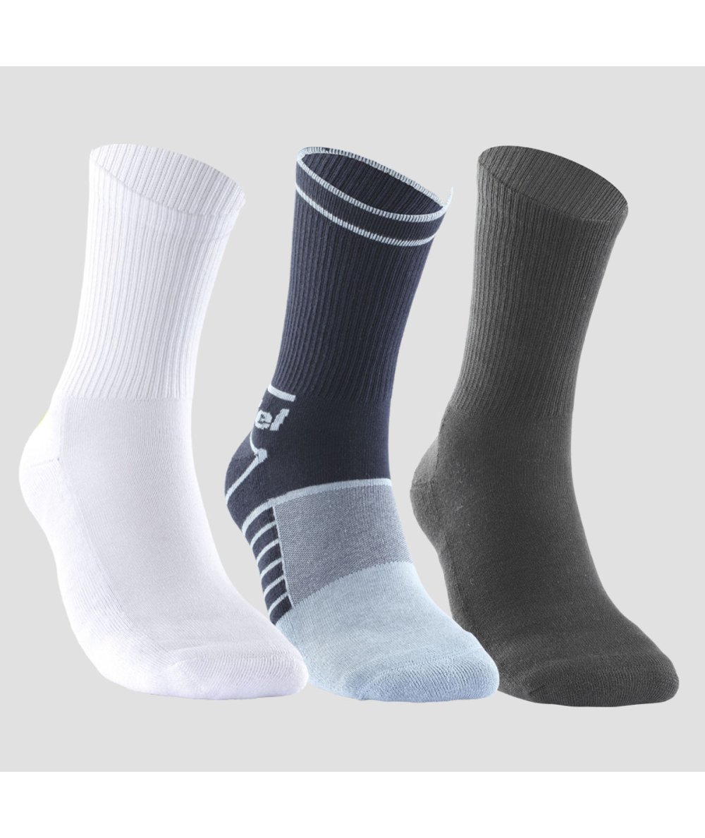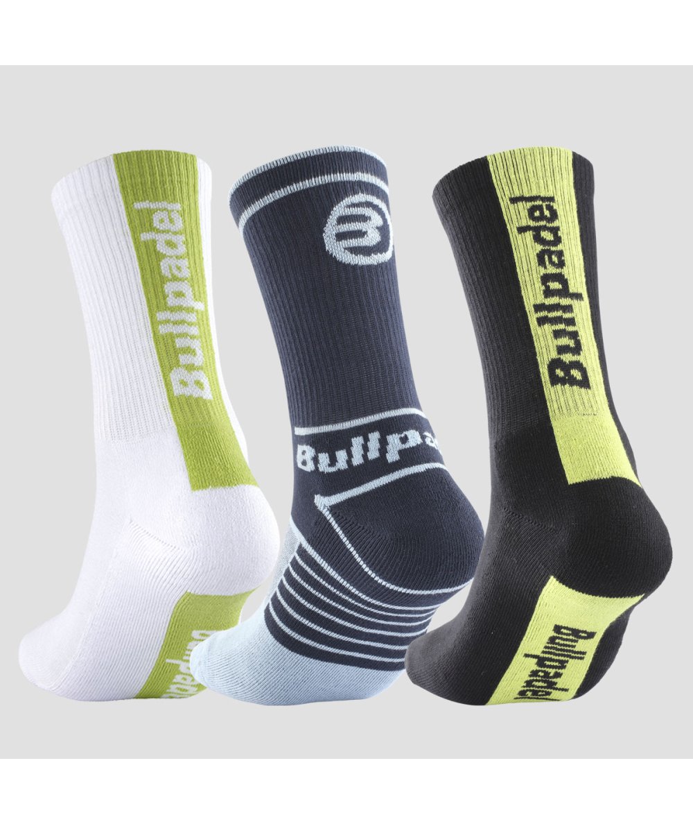 Pack de tres calcetines altos en distintas combinación de color. Fabricados en algodón y poliamida elástica. Pack de tres calcetines altos. Colores: Blanco, Negro y Azul marino Composición: 80% Algodón-15% Poliamida-3% Elastán-2% Elastodieno