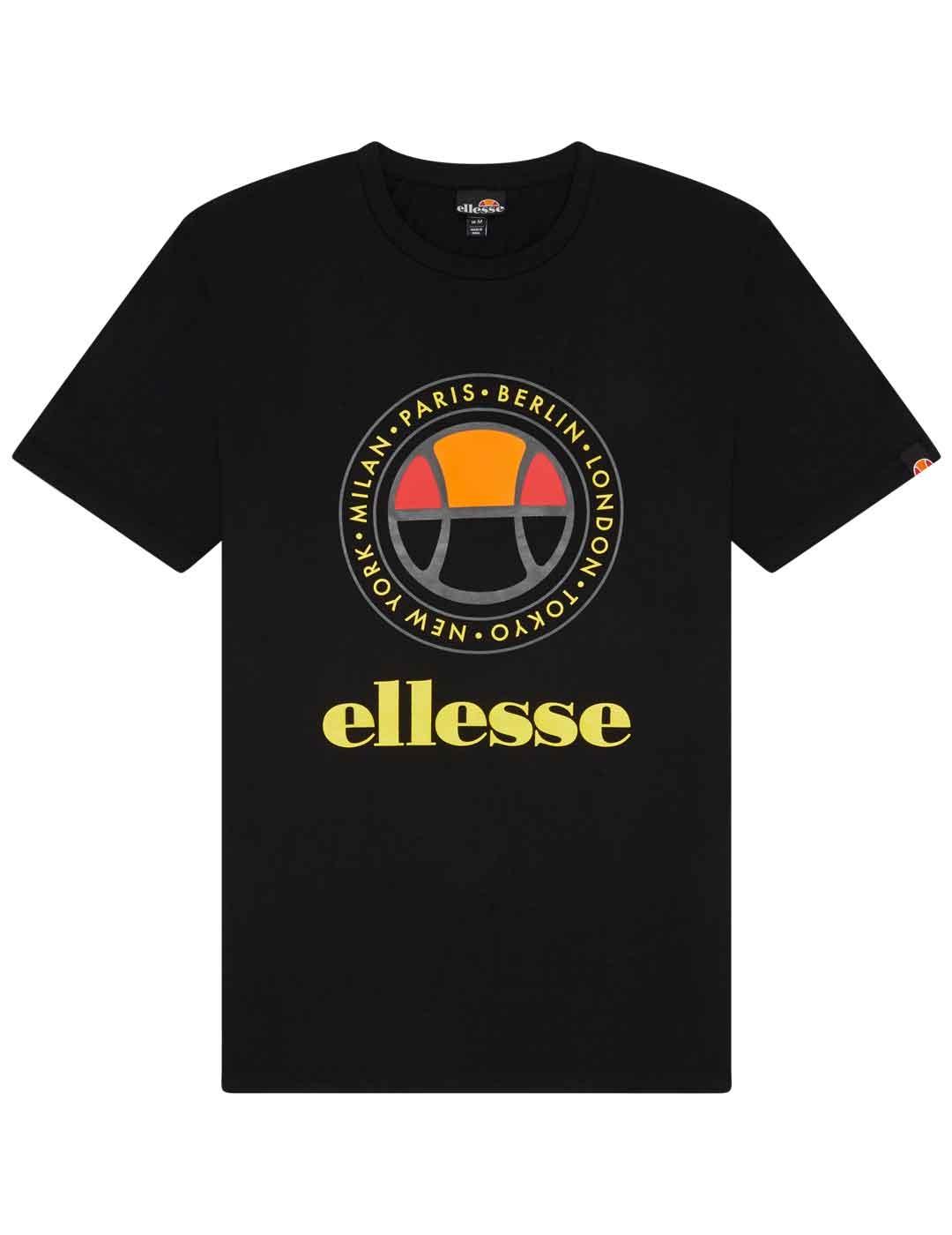 Camiseta Ellesse Campa negra para hombre con el logo en forma redondeada simulando una pelota de basquet. Fabricada en algodón premium, manga corta, cuello redondo y corte estándar. Diseño exclusivo hecho con un original dibujo en el pecho que combina los colores clásicos de la marca italiana rodeados por los nombres de las ciudades de Milán, París, Berlín, Londres, Tokyo y Nueva York. Logotipo Ellesse con letras amarillas. 100% Algodón