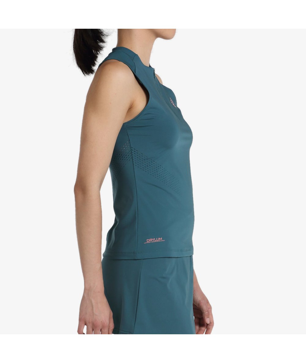 Camiseta sin mangas con media cremallera termosellada, confeccionada en tejido single elástico de nylon. Presenta la firma de nuestra jugadora Gemma Triay y un fitting ajustado. El diseño incorpora una inserción de canalé elástico en los hombros y el cuello, así como perforaciones en el frontal y la espalda para favorecer la ventilación. Además, cuenta con gráficos decorativos en la espalda y el logotipo en el pecho. CAMISETA BULLPADEL ENSAY VERDE BOSQUE 49,95 € Impuestos incluidos ? Producto disponible con otras opciones Talla XSSMLXLXXL Camiseta sin mangas de nuestra línea Purecolor seleccionada y firmada por nuestra jugadora Gemma Triay. Color: Verde Bosque Composición: 80% nylon – 20% elastán. Elastic single jersey.