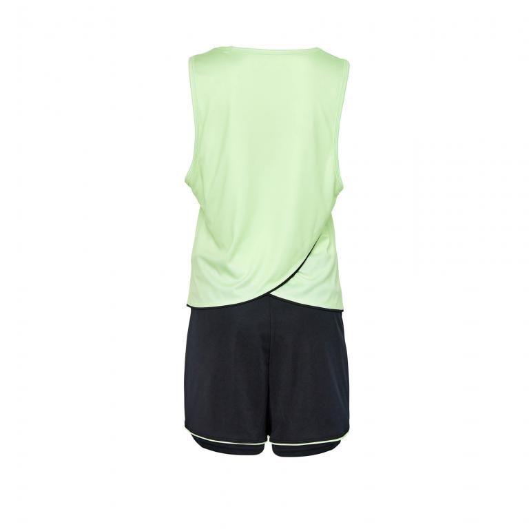Conjunto deportivo para mujer, modelo CROSS compuesto por camiseta sin mangas y pantalón corto. CARACTERÍSTICAS CAMISETA Camiseta deportiva para mujer en color verde, fabricada en tejido resistente y ligero. La camiseta está confeccionada con poliéster para garantizar su rápido secado, y con elastano, que favorece la elasticidad y flexibilidad, por lo que son perfectas para la práctica de todo tipo de deportes. Esta camiseta técnica está fabricada con la tecnología SINCRONIC, que evita arrugas y deformación en los tejidos. Otras características: – Cinta cubre costuras en el cuello para un contacto más suave con la piel. – Etiqueta de talla impresa en camiseta para evitar roces. CARACTERÍSTICAS PANTALÓN Pantalón corto de deporte para mujer en color negro con detalles en verde, fabricado en tejido resistente y ligero. El pantalón está confeccionado con poliéster para garantizar su rápido secado, y con elastano que favorece la elasticidad y flexibilidad, por lo que con este pantalón de deporte tendrás libertad de movimiento. El pantalón, tiene un buen ajuste gracias al cordón interno en cintura, dos bolsillos laterales, y está confeccionado con la tecnología SINCRONIC, que evita arrugas y deformación en los tejidos. Este pantalón tiene una malla corta incorporado que proporciona mayor sujeción. Fabricación: 100% Poliéster con elastano Tecnologías de los conjuntos deportivos J’hayber: – ADAPTEX: Facilita la adaptabilidad y la flexibilidad. Tejido ligero, anti-adherente y de secado rápido. – FLEXYDRY: Prenda con elastano, que favorece la elasticidad y flexibilidad, y poliéster, que garantiza su rápido secado. – SINCRONIC: Tecnología que evita arrugas y deformación de los tejidos. Prenda ligera con acabado perchado en su interior, que favorece el volumen y densidad. – WINDPROTEX: Tecnología que protege del viento y de la lluvia suave No se venden las prendas por separado.