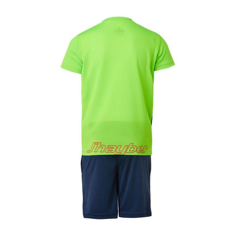 Conjunto deportivo para niño compuesto por camiseta y pantalón corto. CARACTERÍSTICAS CAMISETA Camiseta deportiva para niño en color verde con detalles naranja, fabricada en tejido resistente y ligero. La camiseta está confeccionada con poliéster para garantizar su rápido secado, y con elastano, que favorece la elasticidad y flexibilidad, por lo que son perfectas para la práctica de todo tipo de deportes. Esta camiseta técnica está fabricada con la tecnología SINCRONIC, que evita arrugas y deformación en los tejidos. Otras características: – Cinta cubre costuras en el cuello para un contacto más suave con la piel. – Etiqueta de talla impresa en camiseta para evitar roces. CARACTERÍSTICAS PANTALÓN Pantalón corto de deporte para niño en color marino fabricado en tejido resistente y ligero. El pantalón está confeccionado con poliéster para garantizar su rápido secado, y con elastano que favorece la elasticidad y flexibilidad, por lo que con este pantalón de deporte tendrás libertad de movimiento. El pantalón, tiene un buen ajuste gracias al cordón interno en cintura, dos bolsillos laterales, y está confeccionado con la tecnología SINCRONIC, que evita arrugas y deformación en los tejidos. Fabricación: 100% Poliéster con elastano Tecnologías de los conjuntos deportivos J’hayber: – ADAPTEX: Facilita la adaptabilidad y la flexibilidad. Tejido ligero, anti-adherente y de secado rápido. – FLEXYDRY: Prenda con elastano, que favorece la elasticidad y flexibilidad, y poliéster, que garantiza su rápido secado. – SINCRONIC: Tecnología que evita arrugas y deformación de los tejidos. Prenda ligera con acabado perchado en su interior, que favorece el volumen y densidad. – WINDPROTEX: Tecnología que protege del viento y de la lluvia suave No se venden las prendas por separado.