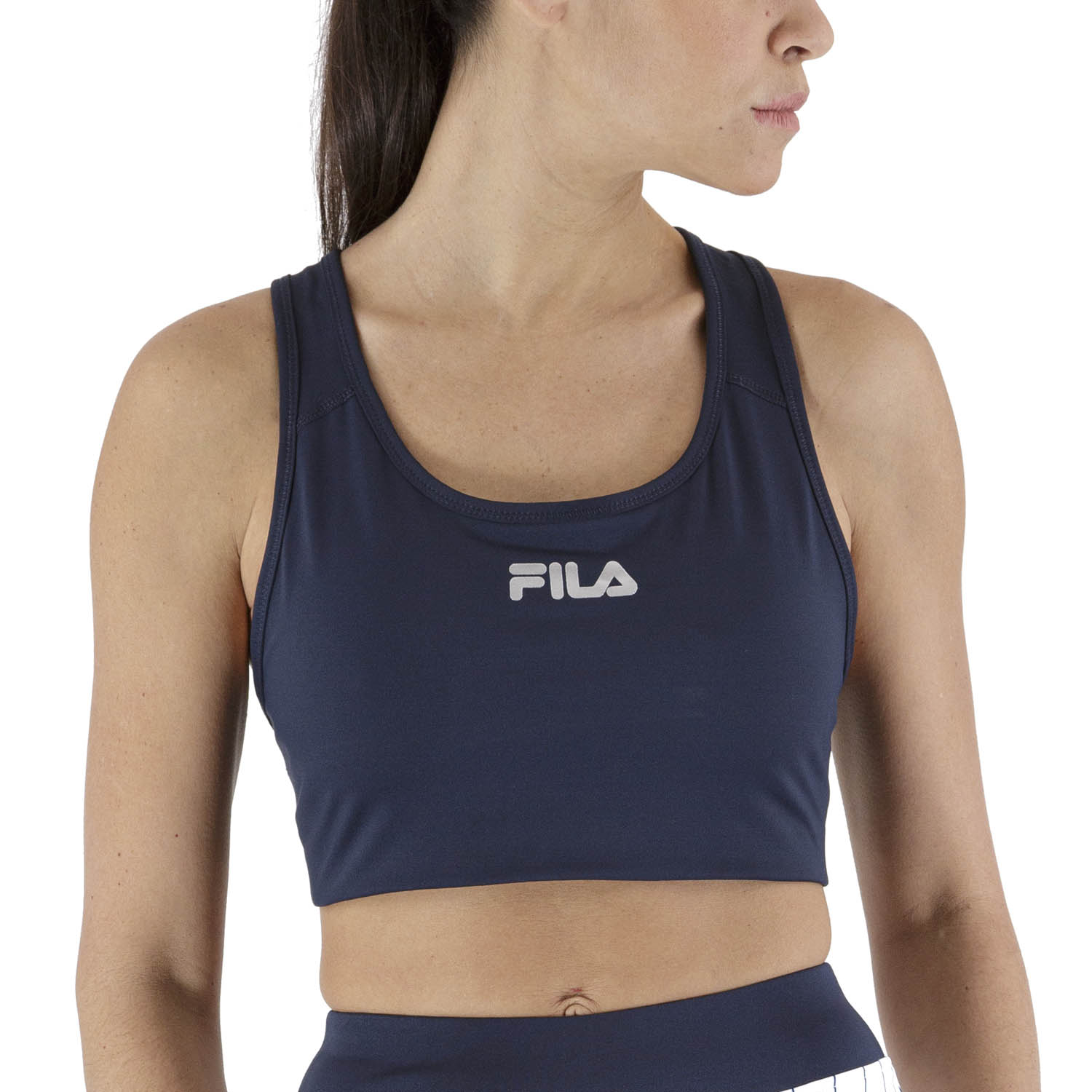 Cuello redondo con cinta interna Costuras planas y sutiles para evitar roces fastidiosos Retro con recorte a la americana para mayor libertad de movimiento Banda elástica debajo del seno para un fit suave Logo Fila reflectante Ajuste adherente Tejido: 87% poliéster, 13% elastano