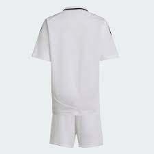 DESPIERTA SU ORGULLO MADRIDISTA Los jóvenes madridistas ya pueden mostrar su apoyo incondicional a los blancos allá donde vayan. Este conjunto adidas del Real Madrid es perfecto para que tu peque se sienta parte del equipo. La tecnología transpirable AEROREADY mantiene la piel seca mientras juega o anima a sus ídolos. Los legendarios colores de la primera equipación y los dos escudos reflejan su precoz compromiso con el club. Este producto contiene al menos un 70% de materiales reciclados. Utilizando materiales reciclados, reducimos los residuos, nuestra dependencia de los recursos finitos y la huella que generan los productos que fabricamos. Corte clásico Cuello de pico Interlock 100% poliéster reciclado AEROREADY Camiseta: inserciones laterales de malla Pantalón corto: cintura elástica con cordón Escudo del Real Madrid termotransferido Color del artículo: White Número de artículo: IT5175