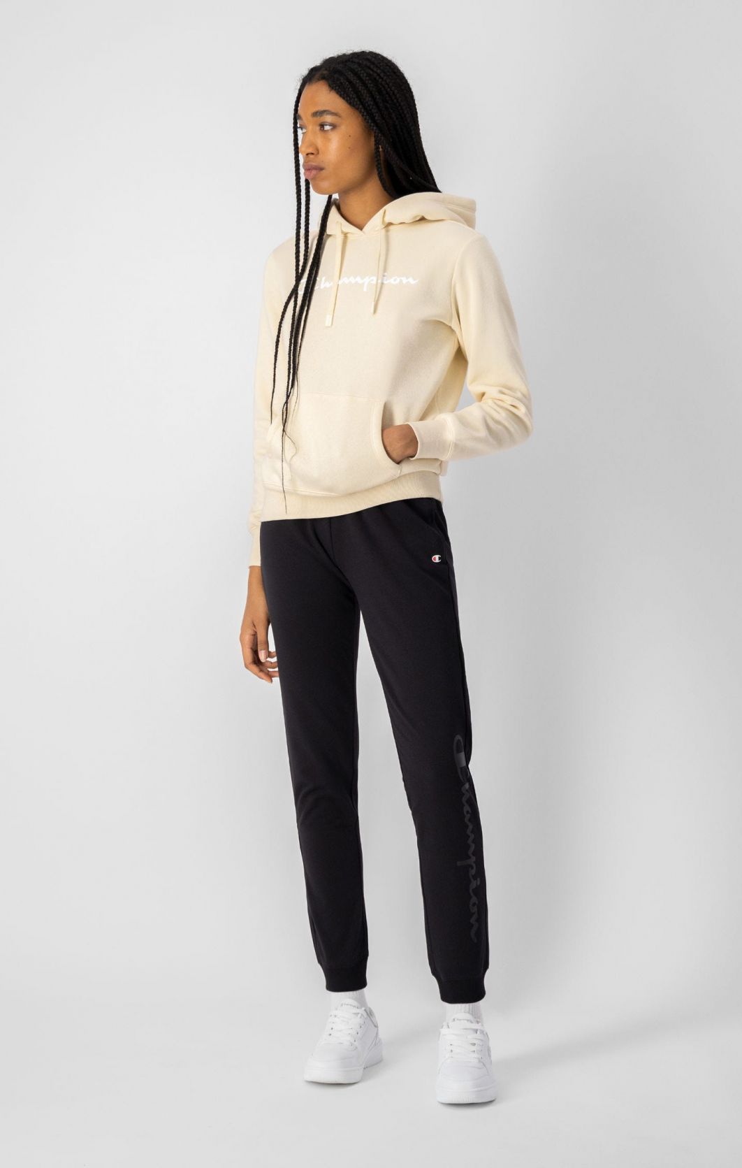 Este pantalón deportivo con puños, confeccionado en felpa de algodón, lleva el logotipo Champion en vertical en la pernera. Una prenda imprescindible para dar un toque nuevo al clásico estilo Champion. DETALLES DEL PRODUCTO Logotipo Champion en contraste estampado por transferencia en la pernera Cordones con rayas verticales Logotipo de la «C» estampado en el muslo Dos bolsillos laterales Cinturilla y puños de canalé Felpa de algodón elástica ligera de 240 g/m2 95% algodón, 5% elastano Regular Fit Modelo: 175 cm / 5′ 74 de estatura, talla S