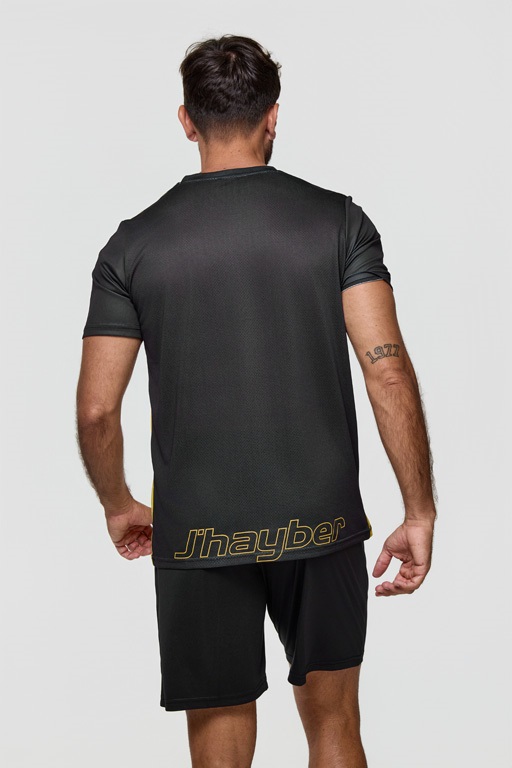 El conjunto Set combina una estética moderna con funcionalidad, gracias a su camiseta negra decorada con detalles en tonos amarillos que aportan dinamismo visual y contraste. El pantalón negro con bolsillos laterales refuerza la utilidad del conjunto sin perder su estilo deportivo. Está confeccionado con tejidos ligeros que permiten libertad de movimiento. La espalda transpirable mejora la ventilación en actividades intensas, y el pantalón cuenta con cintura elástica y cordón ajustable para mayor comodidad. Composición: 100% Poliéster.