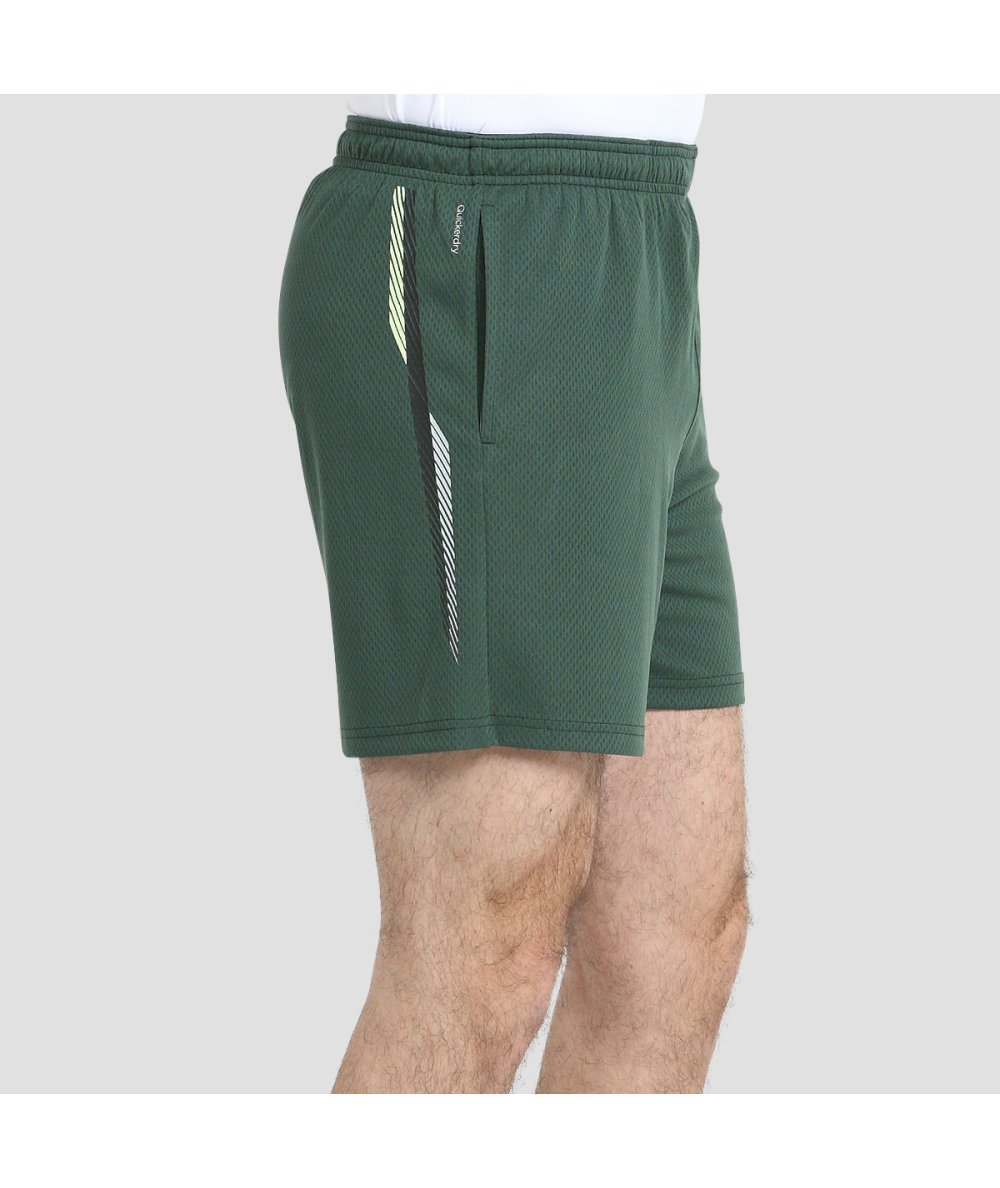 Short de 42 cm de largo, con cinturilla elástica con cordón ajustable, bolsillos laterales, braguero interior y gráfico de la línea en el latera. Fabricado con tejido ligero en poliéster con efecto Fake Mesh. Se le aplica el acabado Quickerdry, tecnología que utiliza microfilamentos para reducir la humedad y ayudar a la transpiración. Short de hombre de nuestra línea Court. Color: Verde bosque Composición: 100% Poliéster. Marbled fake mesh Tejido técnico: Quickerdy