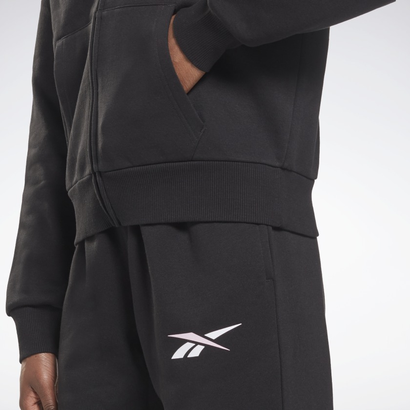 SUDADERA CON CAPUCHA DE FELPA SUAVE CON CREMALLERA LARGA Cada nuevo día es diferente al anterior. Haz de esta sudadera con capucha Reebok para mujer una constante. El cierre de cremallera largo te permite adaptarte al clima y cambiar de estilo. El gran logo Vector en el pecho subraya su amor por el estilo deportivo. SOBRE EL MODELO Ajuste holgado Material: felpa 70% algodón / 30% poliéster reciclado Cremallera completa capucha con cordón Bolsillo canguro dividido Puños y dobladillo acanalados Color del producto: negro. Número de modelo: H62058